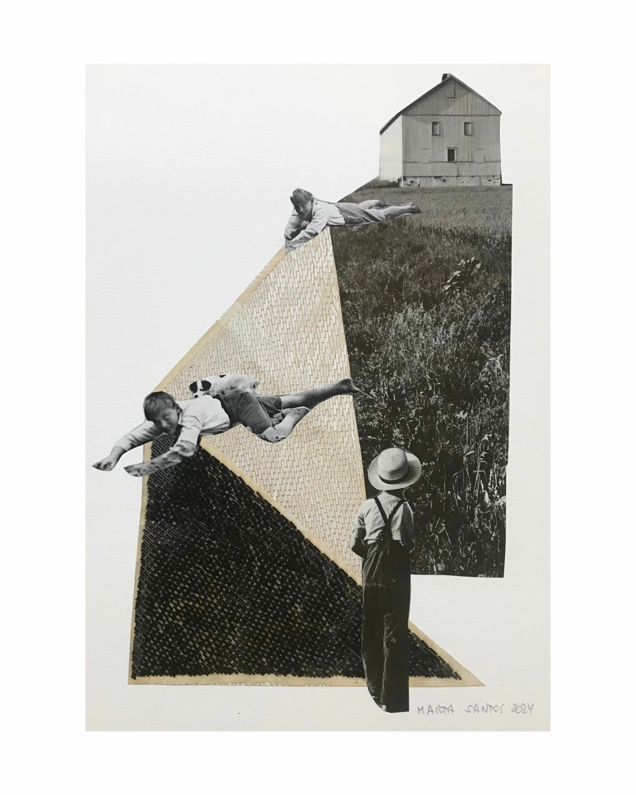 It involves retrieving images from different supports (mainly magazines and old encyclopedias) and extracting them from their context. I then re-pair up and reposition them, in an intuitive process of free image association, while looking for the twist that opens to unexpected connections and runaways, revealing that things are not quite as they seem.